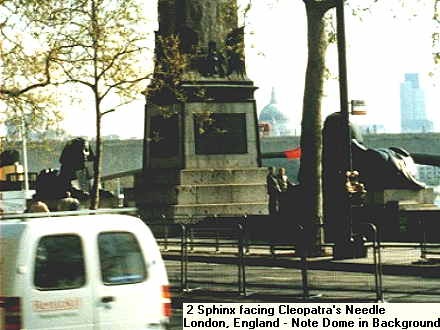 Esfinges foram colocadas em ambos os lados da Agulha de Cleópatra em sua localização em Londres.